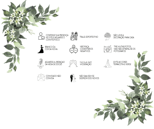 Para garantir que o nosso casamento seja inesquecível para todos, nossa assessoria entrará em contato com cada um de vocês para auxiliar nas dúvidas, mas gostaríamos de compartilhar algumas dicas importantes: