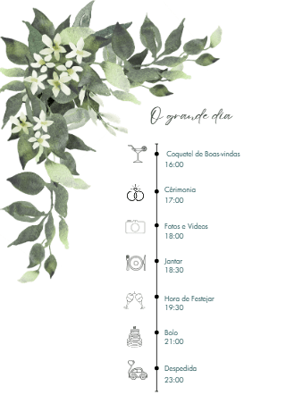 Para garantir que tudo corra conforme planejado e que todos possam aproveitar cada instante desta celebração, pedimos com muito carinho que cheguem no horário previsto. A pontualidade de todos é essencial para o bom andamento do evento e para que vocês possam aproveitar cada segundo conosco.